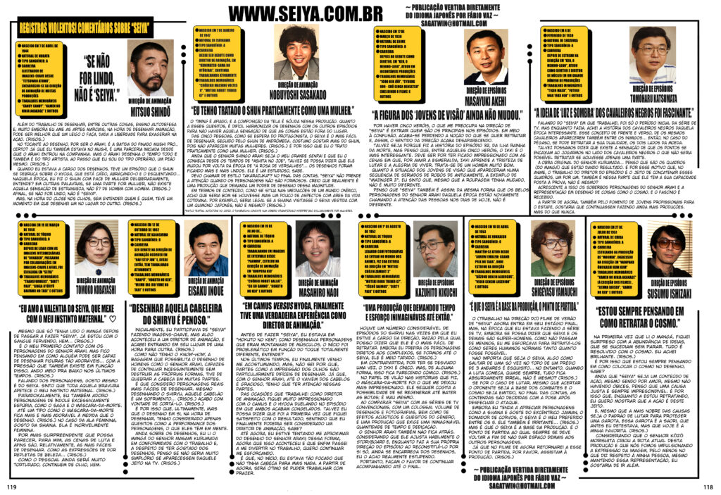 Na primeira vez que li o mangá, fiquei surpreso com a abundância de ideias, que se sucediam sem parar. Tudo é resolvido com o cosmo. Eu achei brilhante. (Risos.) É por isso que estou sempre pensando em como colocar o cosmo no desenho, sabe?
